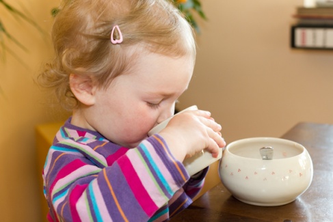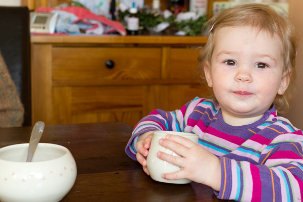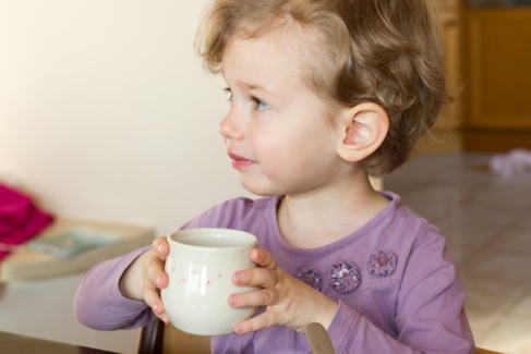 Kleine Kinderhände können den bauchigen Becher sicher umgreifen.